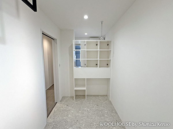 玄関から出入りできるバイクガレージがある家。